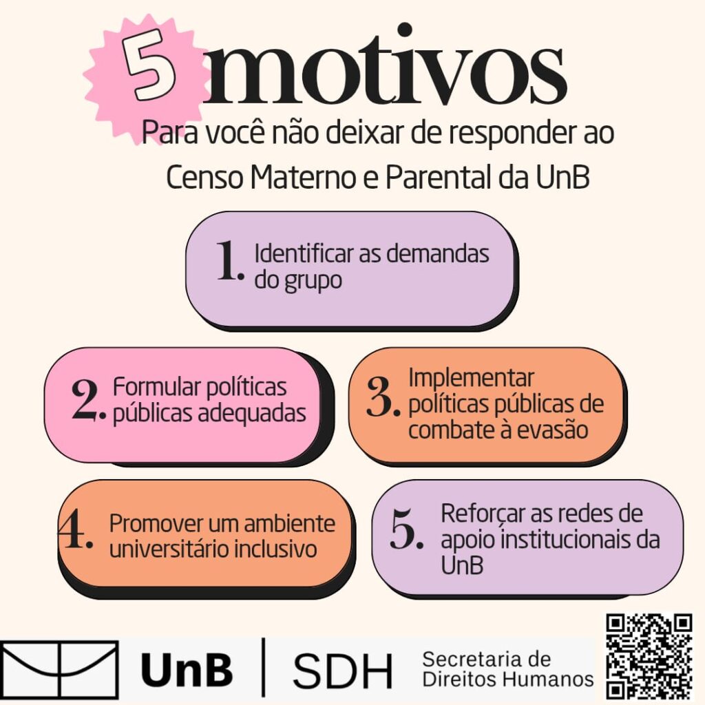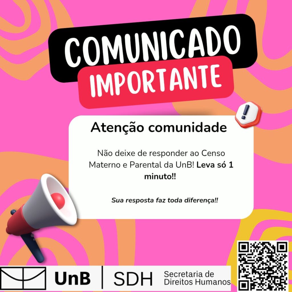 A Coordenação das Mulheres (CODIM), da Secretaria de Direitos Humanos (SDH), da Universidade de Brasília (UnB), com apoio do Coletivo de Mães da UnB e do Grupo de Mães Técnicas da UnB, está conduzindo uma pesquisa com o objetivo de mapear e quantificar a presença de docentes, servidores/as técnico-administrativos/as, discentes e trabalhadores/as terceirizados/as mães, pais e responsáveis legais por crianças até 12 (doze) anos de idade incompletos, nos quatro campi da UnB. Esta ação está em consonância com a Política Materno e Parental da UnB, Resolução CAD Nº 0023/2024, e objetiva subsidiar a efetivação da referida política, no sentido de garantir condições institucionais de apoio e permanência de mães, pais e responsáveis legais por crianças na universidade.